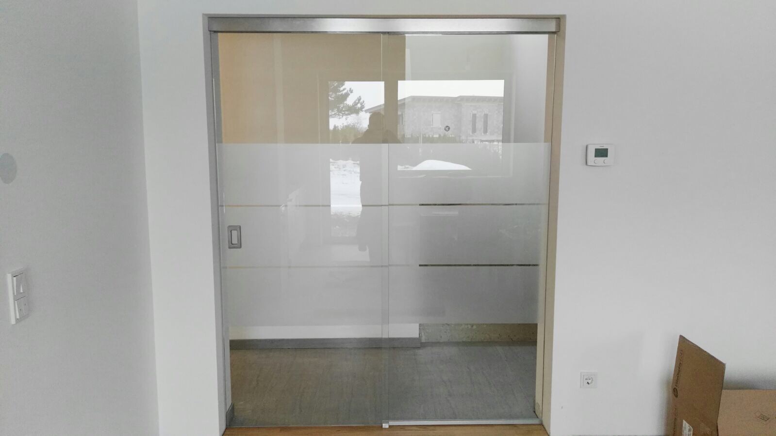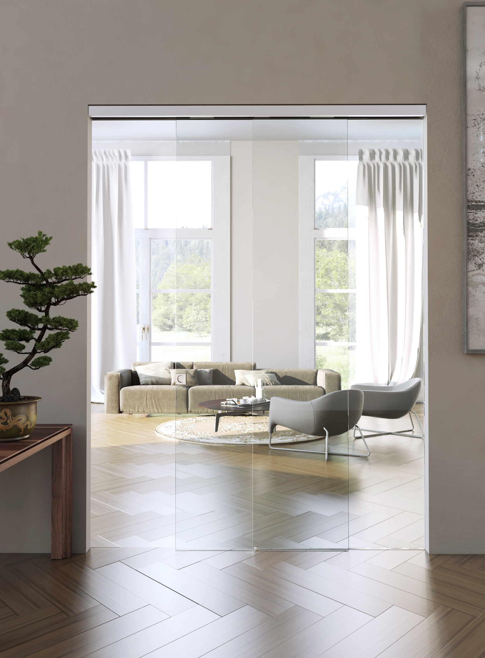 Sliding doors system with fixed panel, wall/ceiling installation